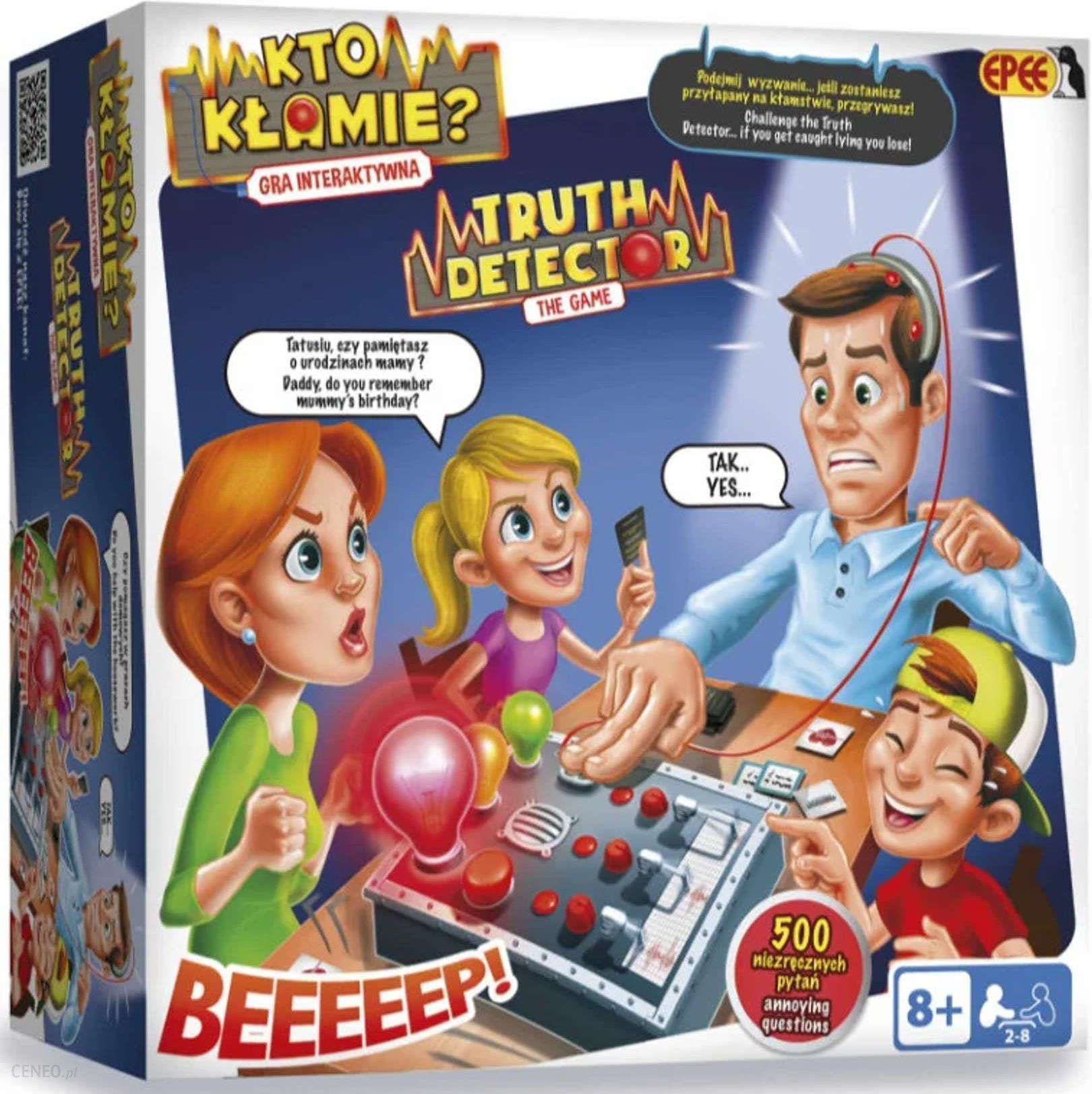 EPEE Kto kłamie? Gra oferuje aż 500 pytań, dzięki którym odkryjesz tajemnice swoich przeciwników. Jeśli kłamią, maszyna Cię o tym poinformuje, ale jeśli nie jest pewna i miga na żółto, musisz zadać pytanie ponownie. Kiedy detektor złapie kogoś na kłamstwie, rozlegnie się dźwięk syreny alarmowej.